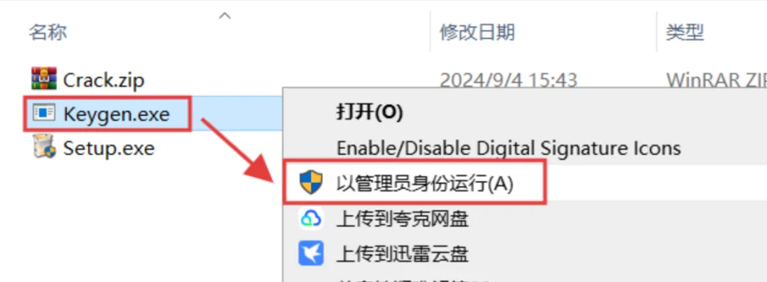 15.选中解压出来的【Keygen】程序,鼠标右键选择【以管理员身份运行】。