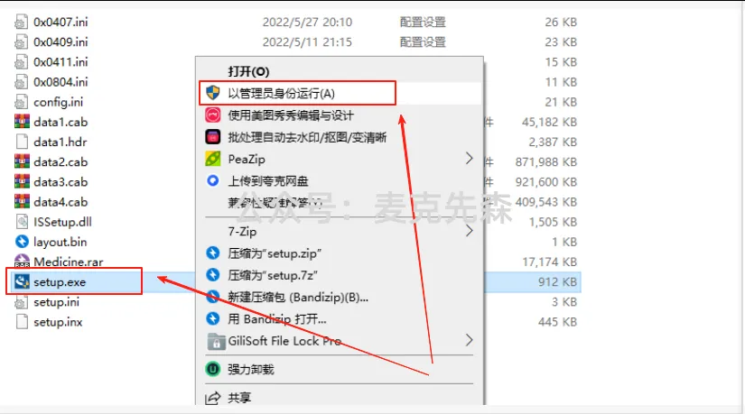 3.找到【setup.exe】应用程序,鼠标右键选择【以管理员身份运行】。