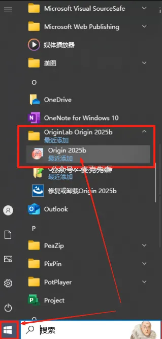 23,点击桌面左下角的【开始】菜单,在应用程序里面找到【OriginLab Origin 2025b】文件夹打开,然后将【Origin 2025b】图标拖到桌面,创建桌面快捷方式。