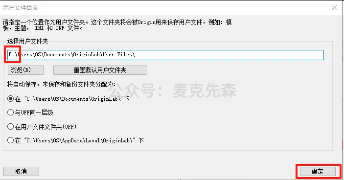 30,修改路径地址中的第一个字符C可设置用户文件目录(如:把C改为D软件目录将存储到D盘),然后点击【确定】。