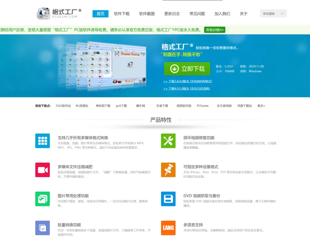 格式工厂是一款多功能的多媒体文件转换工具它几乎支持所有多媒体格式,比如像音频,视频,图片格式等等它转换速度很快,而且还能修复破损的视频文件,而且还能压缩文件,更节省你的空间它还可以转换图片,支持缩放、旋转、水印等常用功能,而且还支持不同语言而且软件完全不收费,看到它就像捡到宝,和你们分享我是很拒绝的