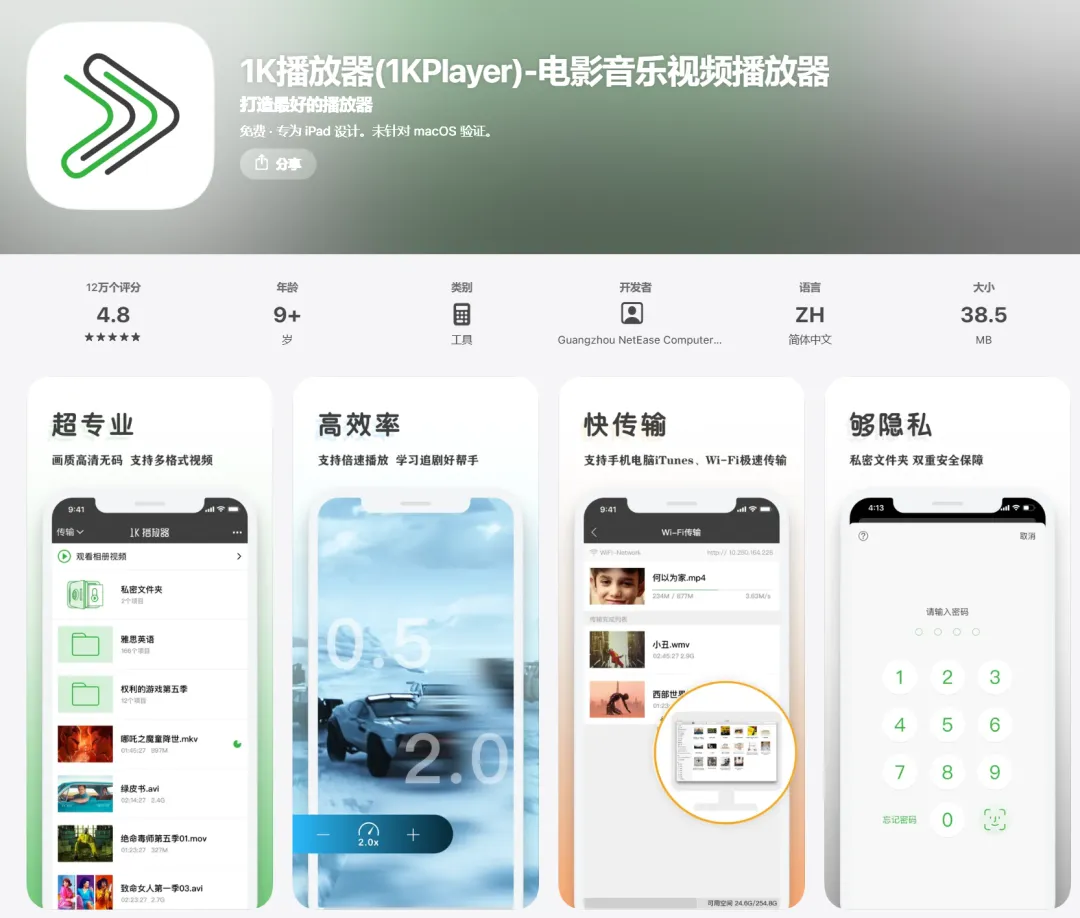 1K 播放器是一个很不错的视频播放器首先它特别简洁和好用,支持倍速,最高两倍速播放,还支持音轨选择可以通过WiFi 和iTunes 传输字幕它的一键投屏到电视上特别好用还可以通过视频链接直接播放视频专有的私密文件夹也是不错的,可以放一些比较私密的内容