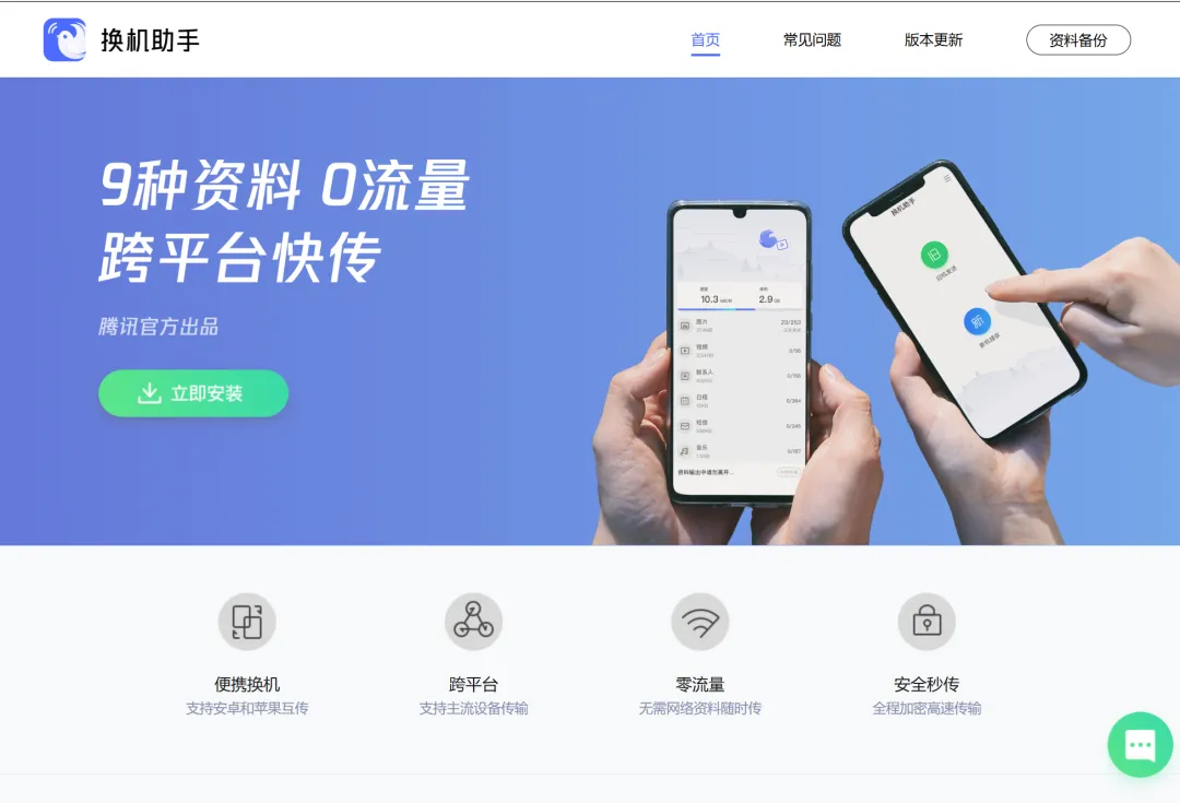 换机助手是腾讯推出的一个手机换机助手当你从一个老手机换到新手机的时候,可以使用它,它可以发送联系人、视频和图片,而且传输速度特别的快,不需要联网就可以实现而且传输过程中还实现了全高速加密模式,可以放心使用同时支持安卓和iOS