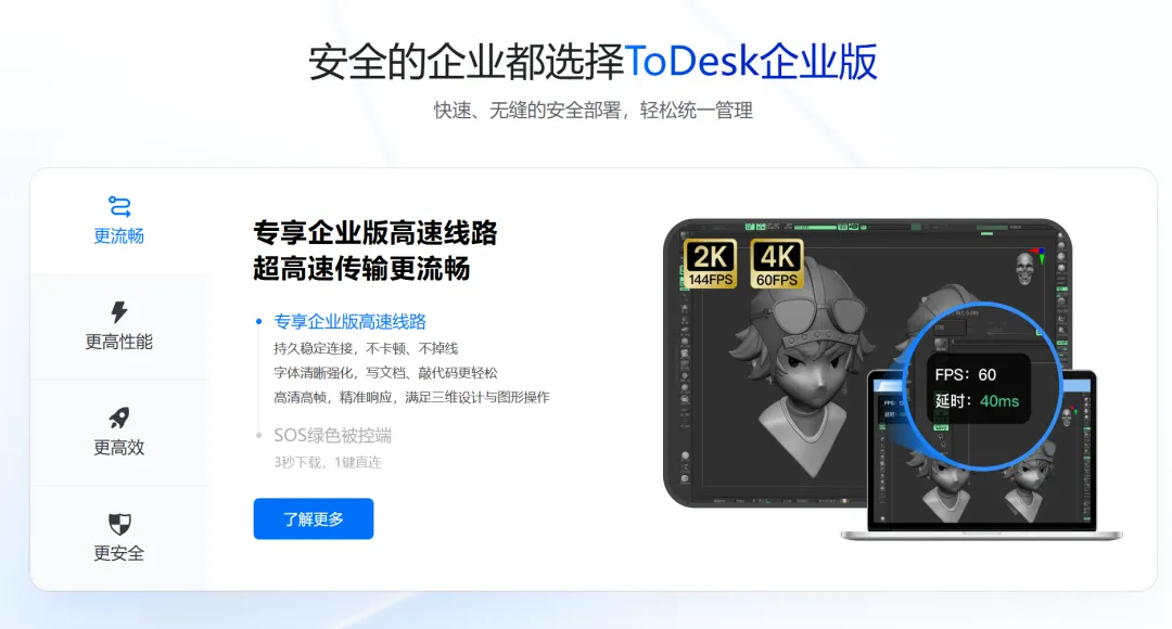 ToDesk 是一款特别方便的远程控制软件它的功能和界面比较像TeamViewer它支持端到端加密,可以放心使用只需要输入用户码和密码就可以远程控制,还可以发消息 / 发文件 / 文件传输还支持1080P 高清屏控制现在远程办公使用,它真的太方便了目前只有windows 版本