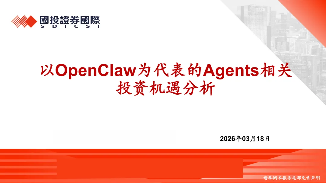 国投证券国际于 2026 年 3 月 18 日发布以 OpenClaw 为核心的 Agents 相关投资机遇分析报告,明确 OpenClaw 的火爆验证 AI 智能体(Agent)需求真实存在,产业链上下游已全面布局,行业进入规模化落地前夜。