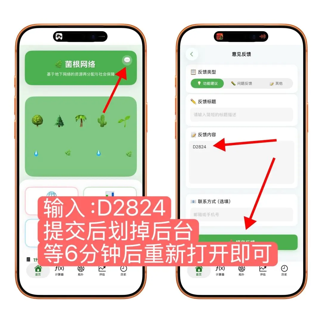 首页,右上角...图标进入意见反馈,在反馈内容出输入:D2824,点击提交反馈后划掉后台,等6分钟后重新打开即可