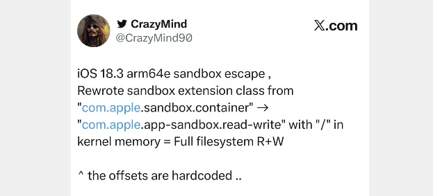 在4月3日下午时段,CrazyMind90 大佬在 X 推特上告诉我们可以使用 DarkSword 漏洞实现 Filza 文件管理器,测试设备是 iOS 18.3 系统,实现sandbox escape 沙箱逃逸。