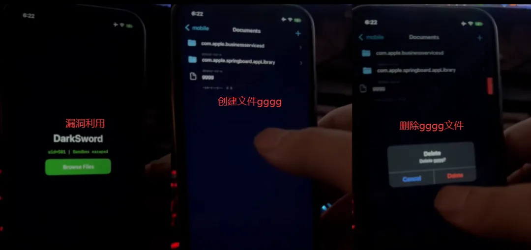 已经有大佬使用 DarkSword 漏洞实现 sandbox escape 沙箱逃逸,意味着能使用 Filza 文件管理器,从大佬分享视频可见,目前已确定可以创建文件、删除文件、读取和写入能力。