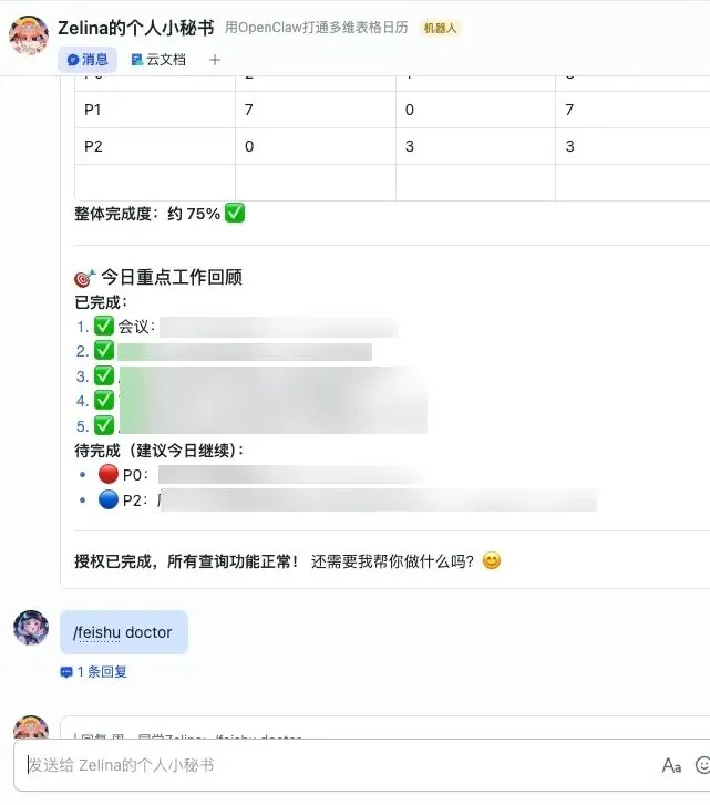 于是第一件事想到的是,打通我过去三年的任务 TODO 多维表格,让 OpenClaw 可以查询我今天的事项,以及能够对我当天的任务做增删改查。