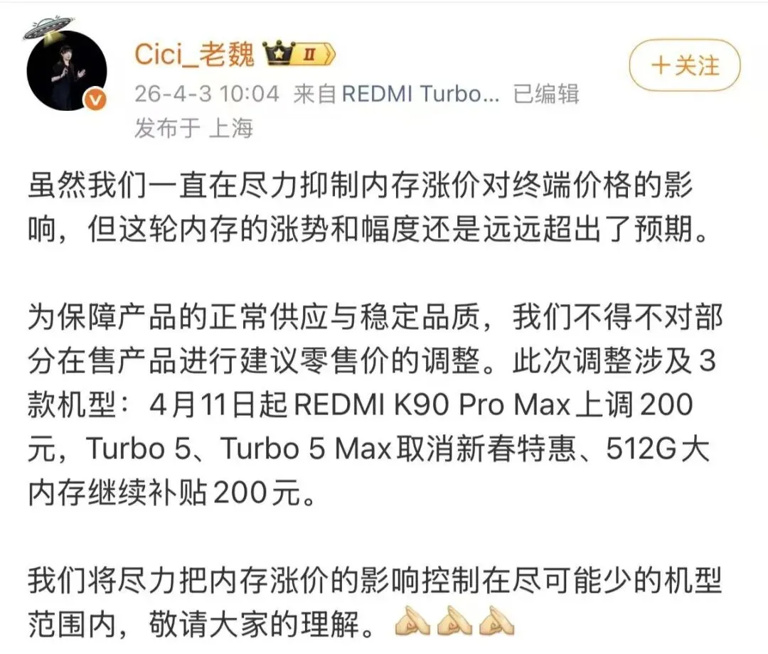 小米正式宣布涨价。从4月11日0点起,REDMI K90 Pro Max上调200元。REDMI Turbo 5、Turbo 5 Max取消新春特惠,512G大内存继续补贴200元。