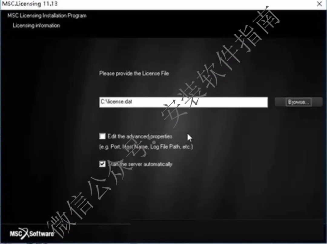 8.如图所示,从C:MSC Softwarelicense.dat找到您的文件,打开以后点next