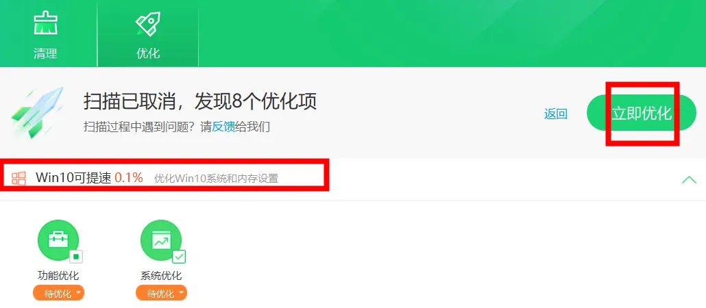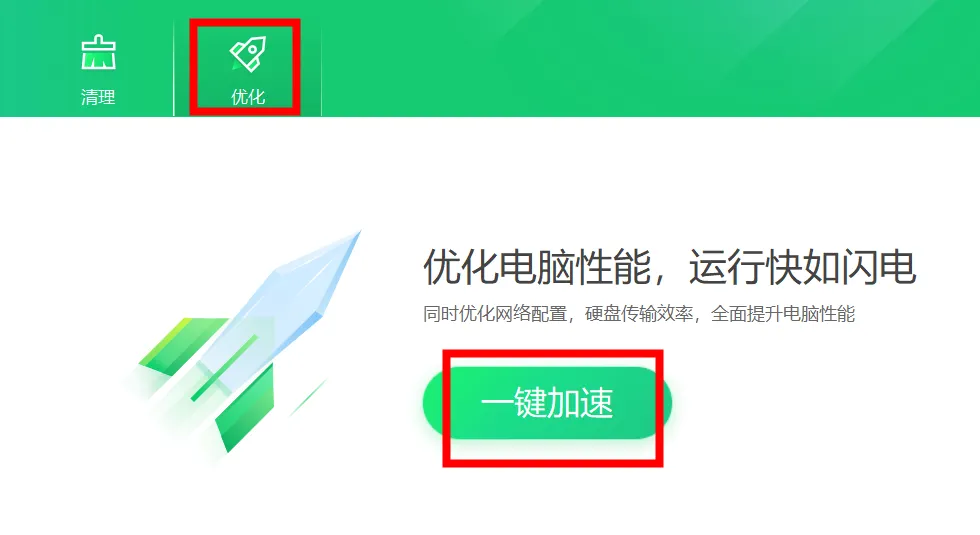 4、点击优化,选择一键加速,软件会扫描可以提速的项目,再点击立即优化,就能有效提升电脑的运行速度和整体性能。