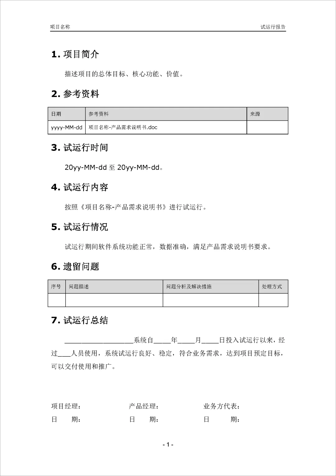 试运行报告总结项目试运行阶段的情况,包括描述项目简介、参考资料、试运行时间、试运行内容、试运行情况、遗留问题和试运行总结等内容。通过这份报告,团队可以全面了解试运行阶段的表现,包括系统功能、数据准确性和满足需求的情况,同时也提供了解决遗留问题的措施和对试运行阶段的总结评价。这有助于评估项目的进展和质量,为后续的正式上线提供重要参考依据。