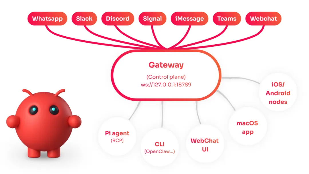 网关是控制平面。会话、路由、频道连接、定时任务、webhook,甚至基于浏览器的用户界面,都通过端口 18789 上的单个 WebSocket 流动。