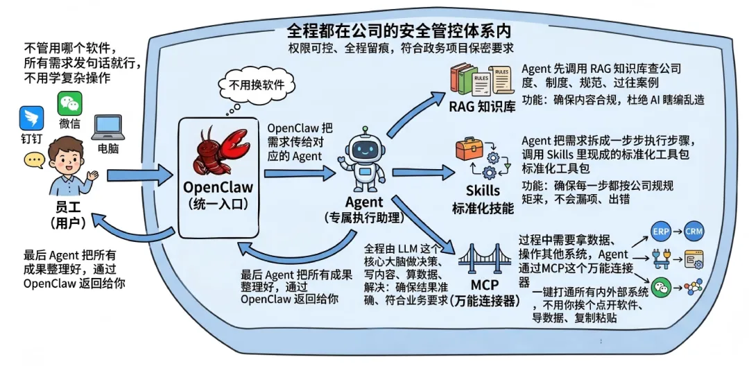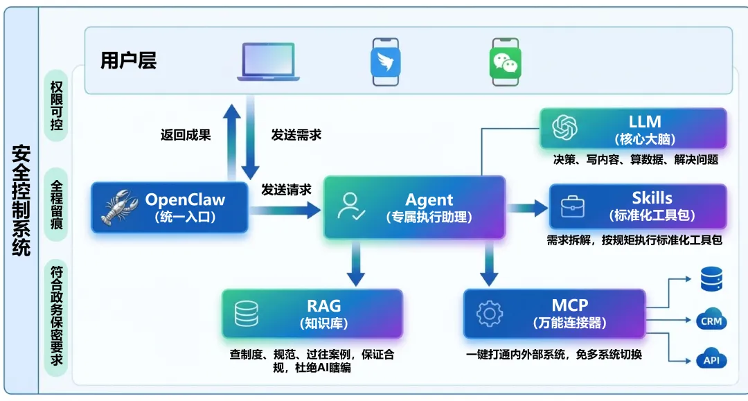 以LLM为核心大脑的Agent,运行在OpenClaw自托管网关之上,通过RAG获取准确知识,用Skills搞定标准化专项工作,通过MCP对接各类业务系统;客户经理通过微信/钉钉等聊天工具直接向OpenClaw下达指令,OpenClaw既作为聊天应用与Agent的联动桥梁接收指令,又作为多Agent协同调度平台拆解任务、调度执行,同时借助自身可视化操作能力完成非标准化操作,最终将结果实时反馈回聊天窗口,形成一个“指令下达-任务拆解-协同执行-结果反馈”的完整智能体闭环,自主完成复杂任务。