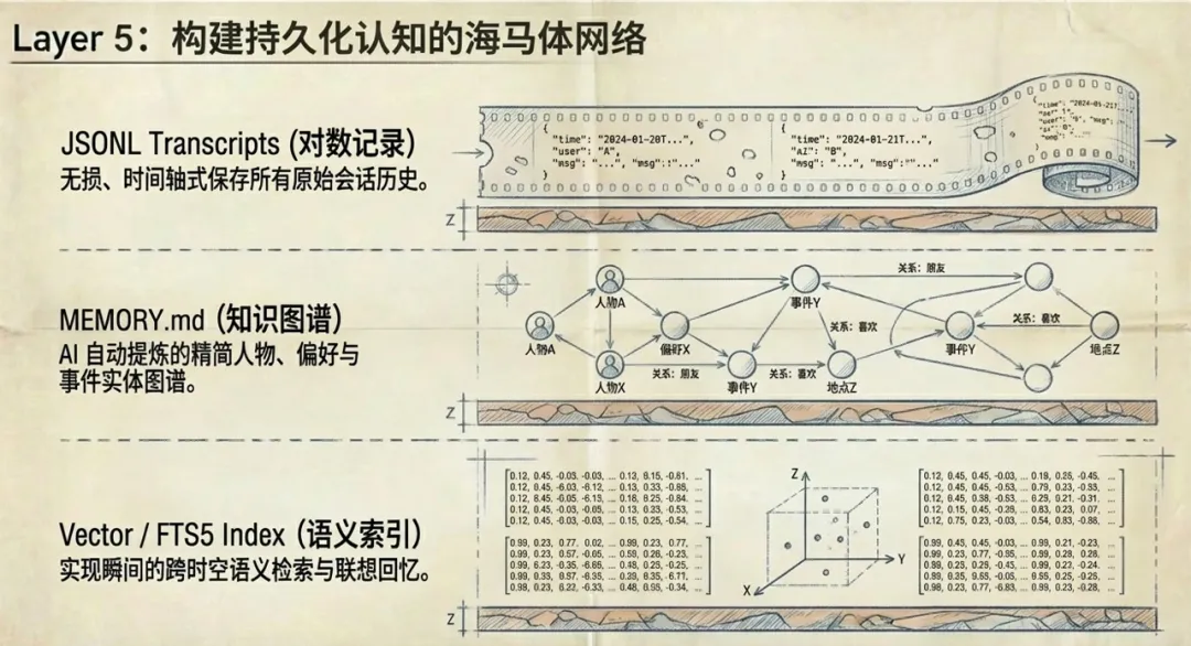 向量检索或 FTS5 全文检索,能从海量的历史日志、用户文档、内部知识中,召回和当前任务高度相关的信息。