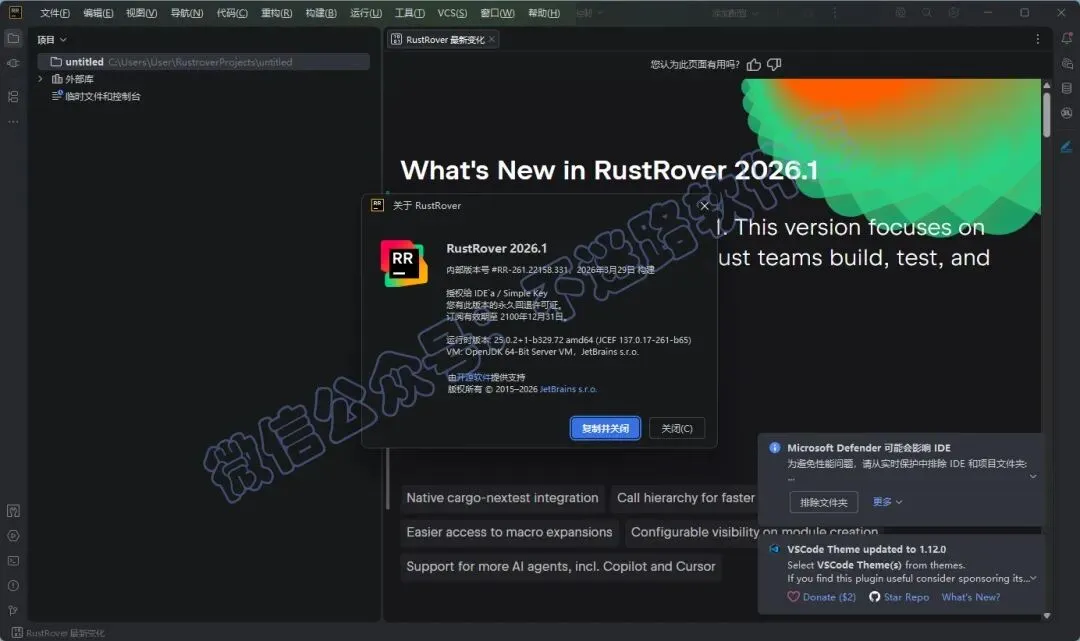 RustRover是由JetBrains开发的Rust语言集成开发环境。RustRover提供全面的开发工具,包括上下文感知代码补全、实时代码分析与快速修复、智能重构和测试调试功能;它深度集成 Cargo 工具链,并支持Web开发(如HTTP客户端和前端技术)、数据库管理(通过DataGrip工具)以及团队协作(如Git、GitHub和GitLab集成)。软件安装