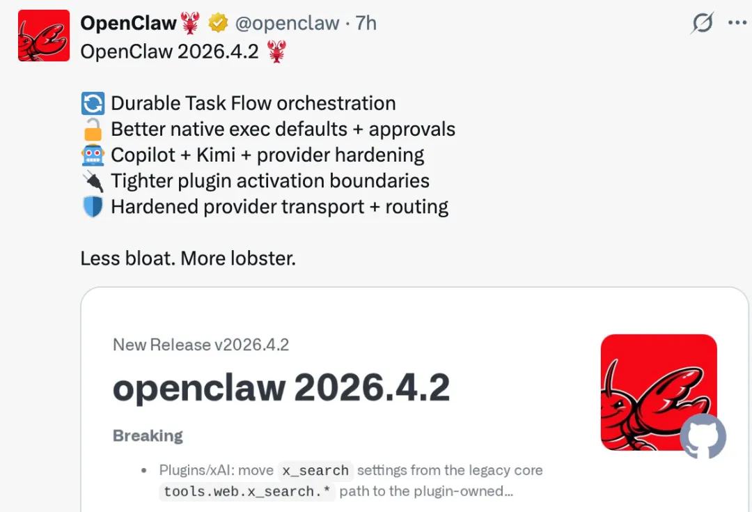 今天,OpenClaw 正式发布了 v2026.4.2 版本,带来了大量令人兴奋的新功能、性能优化和 bug 修复。本版本共计 29 个提交,涵盖插件系统、任务流、平台集成、安全策略等多个核心模块的改进。让我们一起来看看本次更新的亮点!