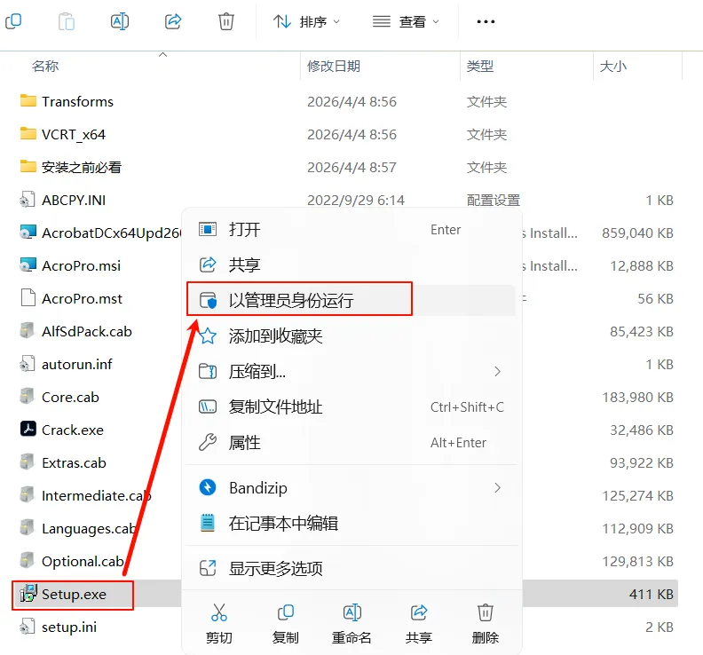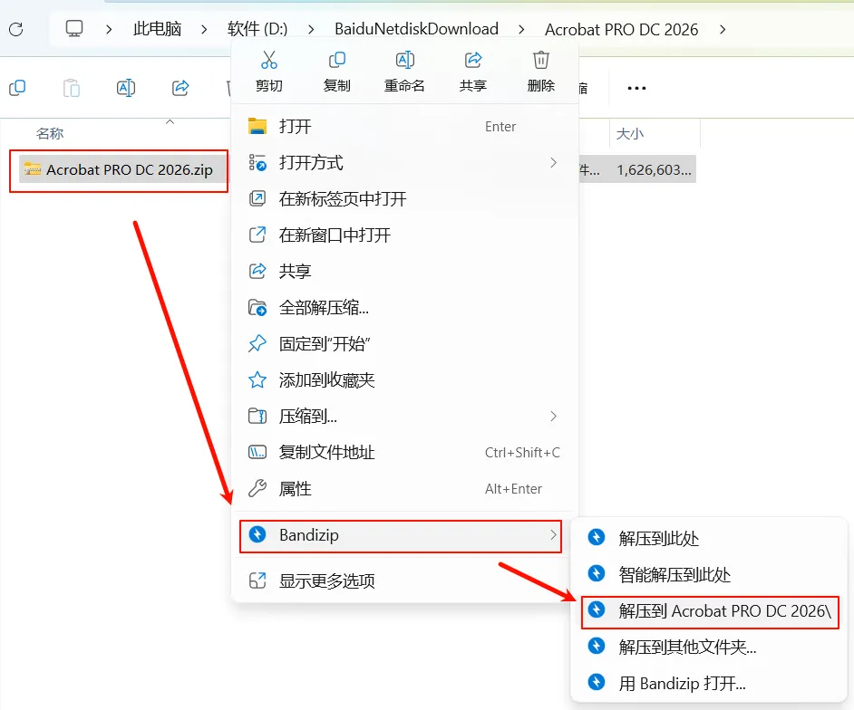 1.选中下载的压缩包,鼠标右键选择解压到“Acrobat PRO DC 2026“文件夹