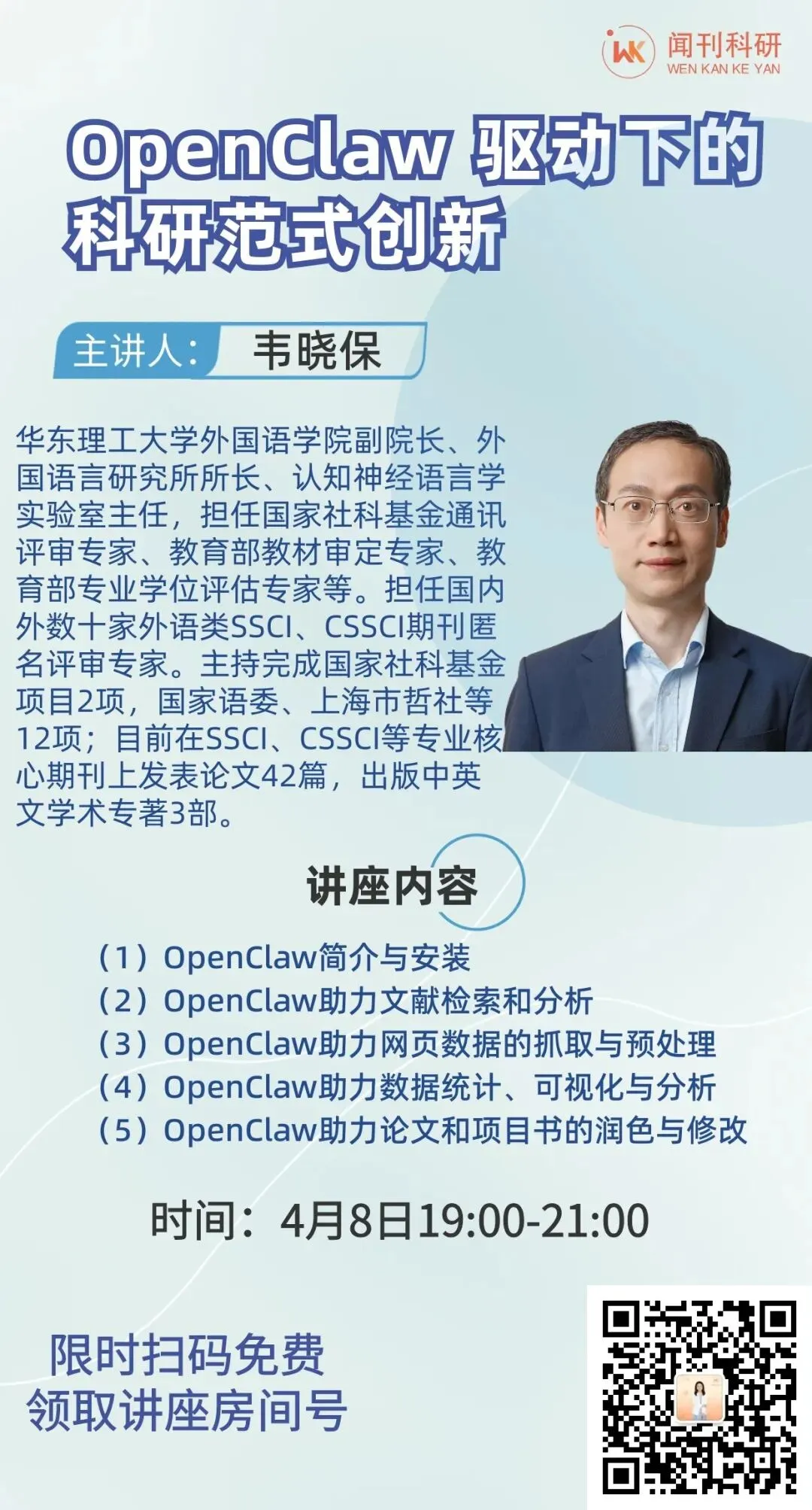 为此,闻刊科研邀请到华东理工大学外国语学院副院长——韦晓保老师,于4月8日19:00-21:00为大家带来《OpenClaw 驱动下的科研范式创新》,将重点分享如何利用2026年主流的OpenClaw框架,将AI打造成为能自主监测文献、处理实验数据的“数字劳动力” 。引导大家在提升写作效率的同时,始终保持学术严谨性与独立思考,真正实现让工具为思想所用。