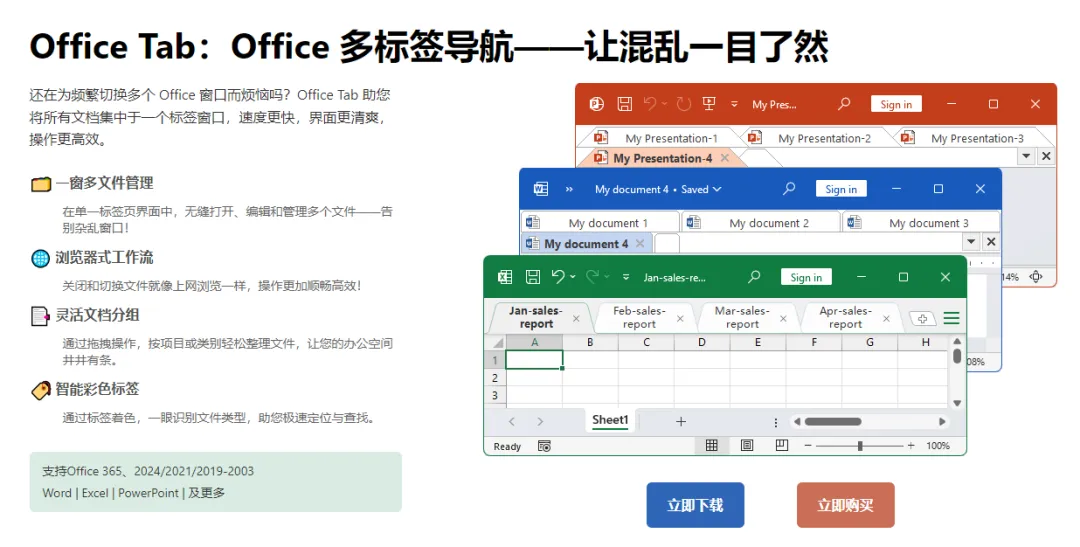 Office Tab 是一款 Windows 平台的 Office 多标签插件,能为 Word、 Excel、PowerPoint 等 Office 系列软件添加标签功能。