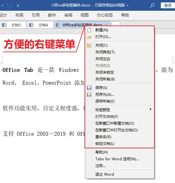一键保存全部文档、锁定文档、快速关闭/新建/打开文档、重命名等,非常方便。