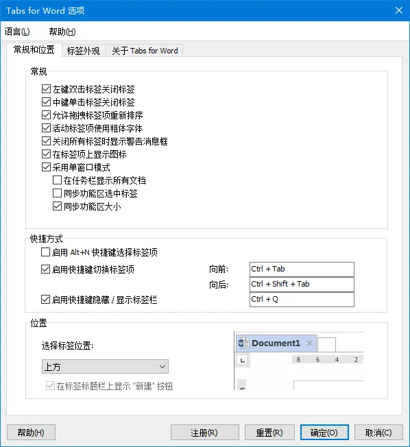 在「选项 - 常规和位置」中,则可以设置标签关闭方式、显示模式、快捷键和位置等,让它用起来更加顺手。