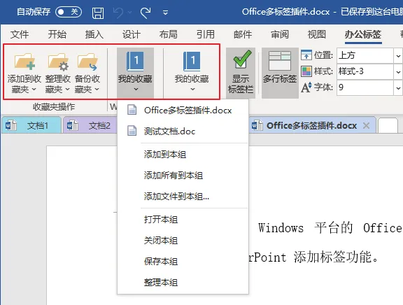 通过「办公标签 - 添加到收藏夹」选项,可以将常用的文档添加到收藏分组当中,方便下次使用。