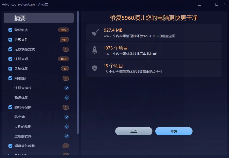 软件的主界面如下,看起来科技感十足,但是操作逻辑却异常简单,你根本不需要去研究那些复杂的设置,中间那个大大的“扫描”按钮,配合上下方的AI模式,简直就是为懒人量身定制的。你只需要点一下,它就会自动通过AI算法去检测你的电脑哪里有垃圾、哪里有漏洞、哪里可以优化,全程自动化,去喝口水的功夫,它就把电脑给你收拾得服服帖帖,特别的省心。