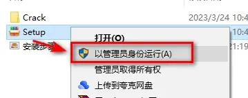 2.选中Setup,鼠标右键选择“以管理员身份运行”