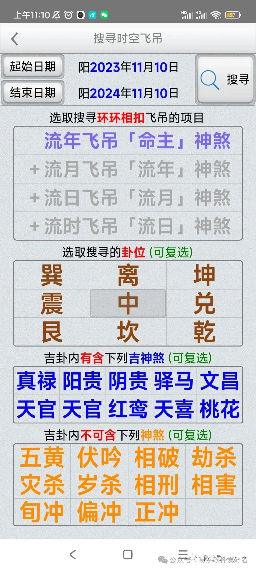 提供指定一个日期范围,并指定搜寻飞吊的项目、卦位及不可含的神煞,即可快速度到符合的日时。