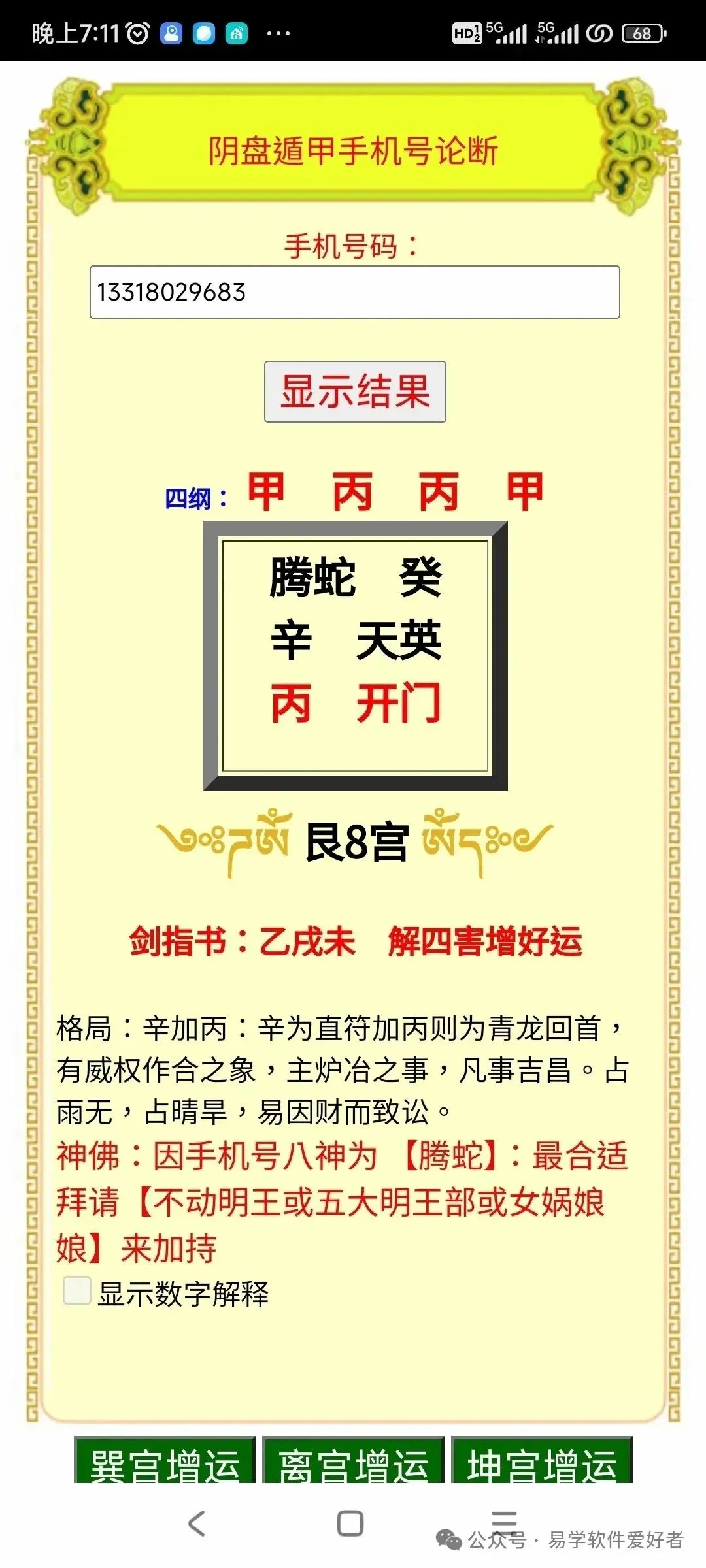 手机版吉祥坊阴盘手机号码论断软件手机版吉祥坊阴盘手机号码论断软件,带解四害增运功能。卖68元,需要的联系,加微信:A-118774软件介绍: 吉祥坊阴盘手机号码论断软件,带解四害增运功能。可根据号码推得四纲,宫位,格局,手机号八神,应加持何神佛。及数字奇门解释论断。