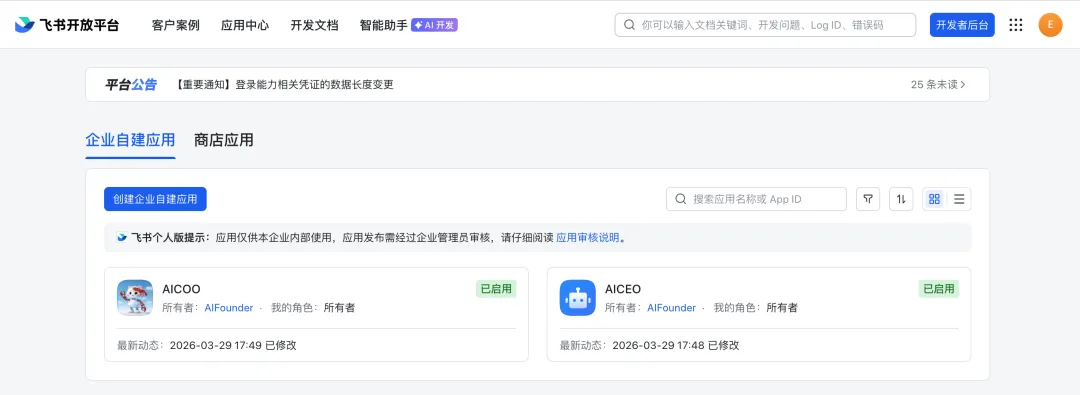 要让 OpenClaw 能够接收和发送飞书消息,我们需要在飞书开放平台创建一个企业自建应用,并获取必要的凭证信息。