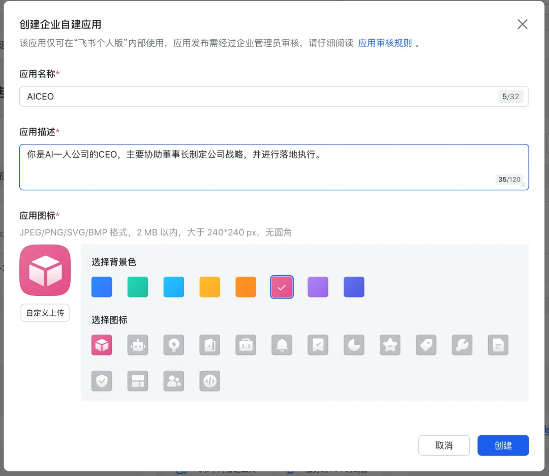 点击“创建企业自建应用”,填写应用名称(如“我的助理”)和描述。