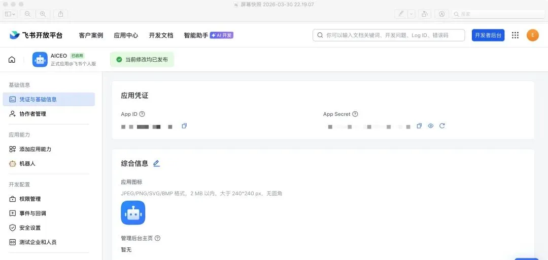 创建后进入应用详情页,点击“凭证与基础信息”,获取App ID和App Secret。