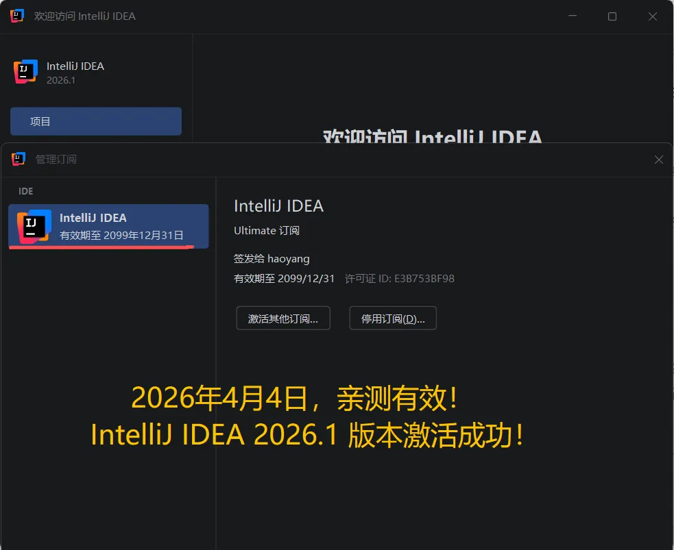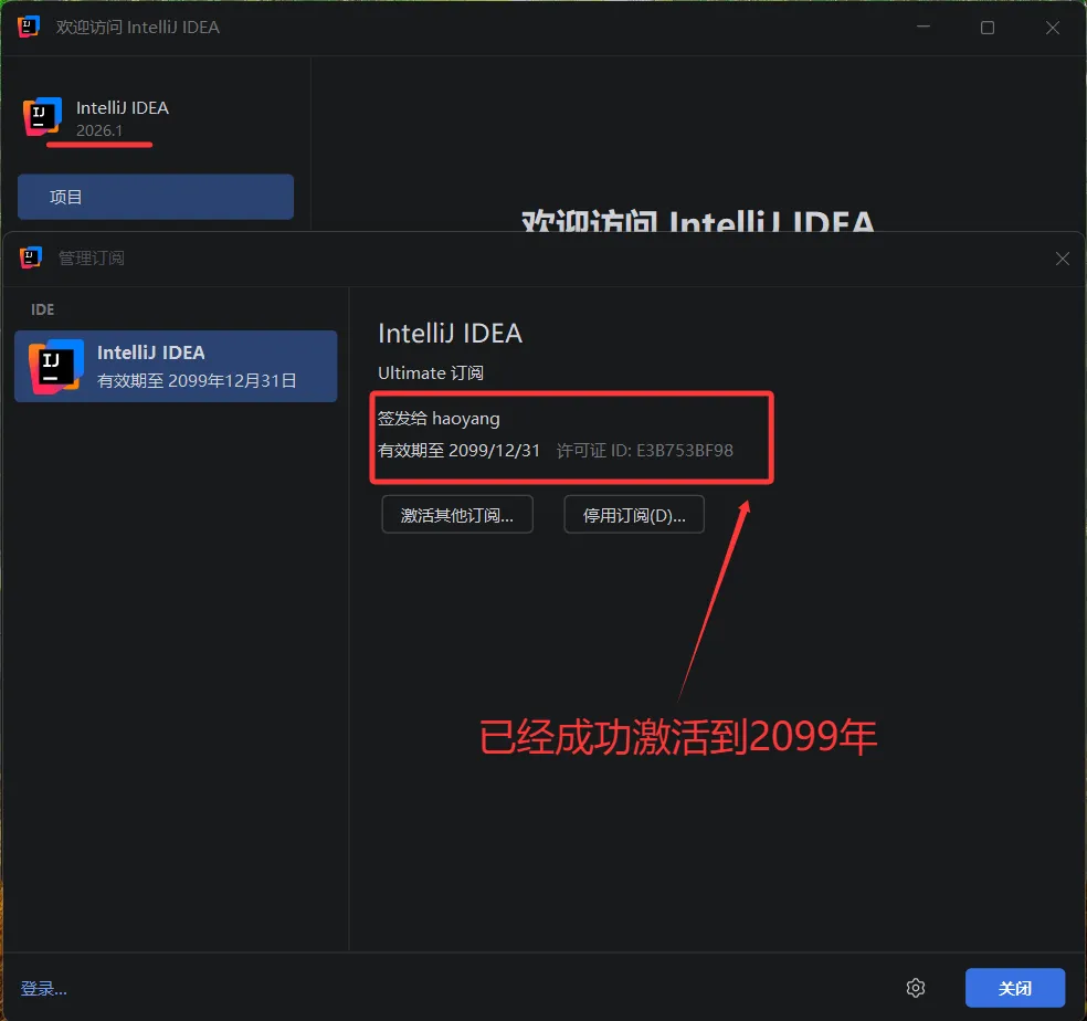 废话不多说,先上 IDEA 2026.1 版本破解成功的截图,如下,可以看到已经成功破解到 2099 年辣,舒服!