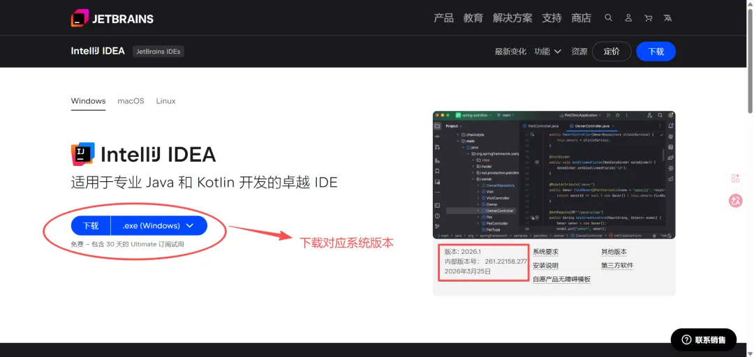 访问 IDEA官网中文站:https://www.jetbrains.com.cn/idea/download/ ,下载 IDEA 2026.1 版本的安装包。