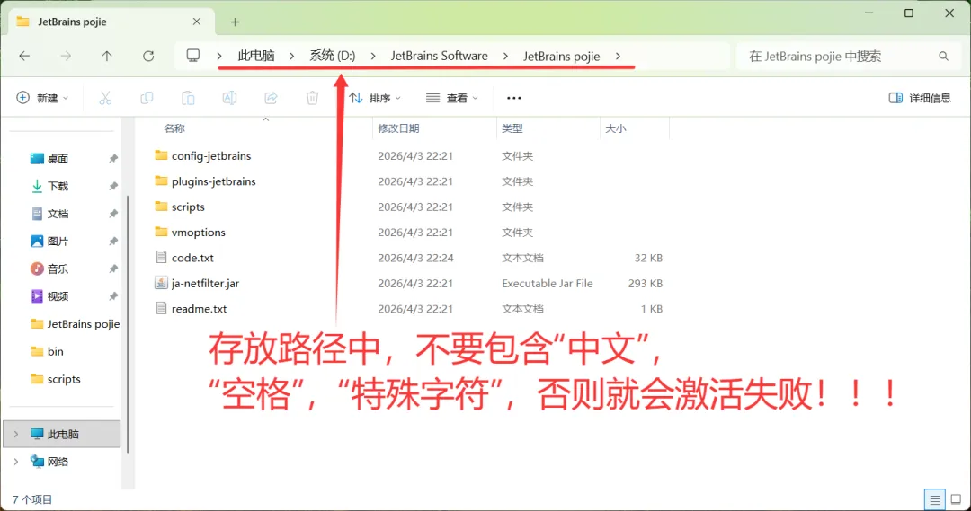 下载成功后,是个压缩包,我这里解压到了 D:\JetBrains Software\JetBrains pojie 文件夹下。注意,将它解压到一个路径中没有 “中文”,“空格” ,“特殊字符”的位置,一定要这么做,不然会导致破解失败!!