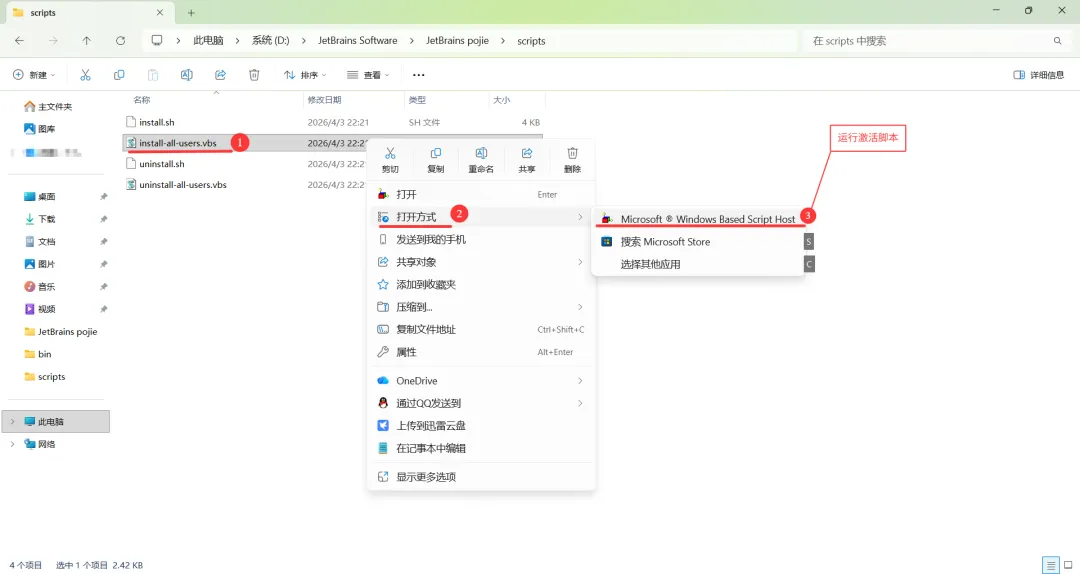 /scripts 脚本文件夹下,对于 Windows 系统用户,鼠标右键 install-all-users.vbs,打开方式选择下图所示(或者双击打开也行),运行此脚本,它的作用是为当前系统所有用户执行破解: