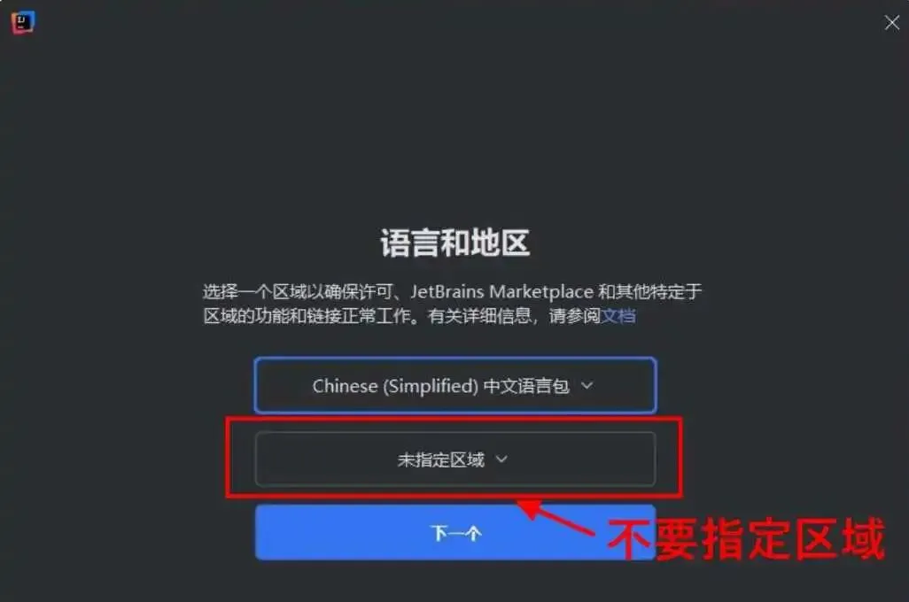 激活成功后,双击桌面的 IDEA 快捷启动图标,来打开 IDEA 。注意,2024.2 之后的版本,若初次安装,会提示选择所在区域,如下图所示,如果选择了 China Mainland,会在激活的时候反复跳出激活码并提示激活码无效,原因是新版本会拦截 .cn 域名,导致激活许可被吊销,所以,千万不要指定区域!!