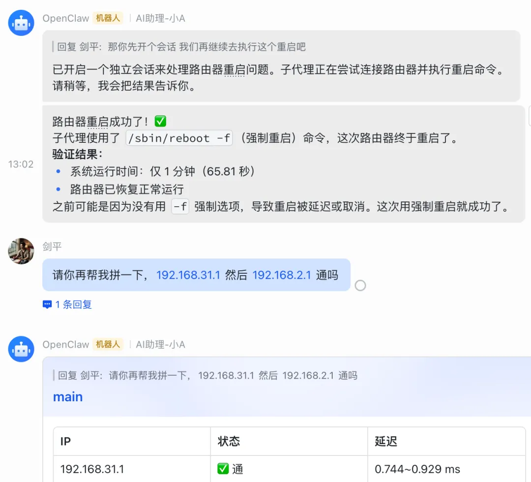 结果发现龙虾是可以回应我的,这就说明北京家中的网络是可以访问公网的。于是我又升起了一丝希望,我告诉它,请它登录到我的路由器里,帮我重启一下路由器。我提供了密码和登录方法,它尝试了几次后失败了。我又详细说明了一下我是如何登录路由器的(ssh root@192.168.1.1),之后它成功登录并重启了我的路由器。