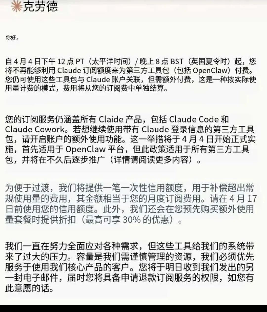 而且Anthropic还挺会选时间,4月3号周五晚上,专门挑大家快下班、没心思关注消息的时候,给所有OpenClaw用户发通知,说第二天起,会员额度不能用在OpenClaw上了,想用就得单独花钱,按次计费。