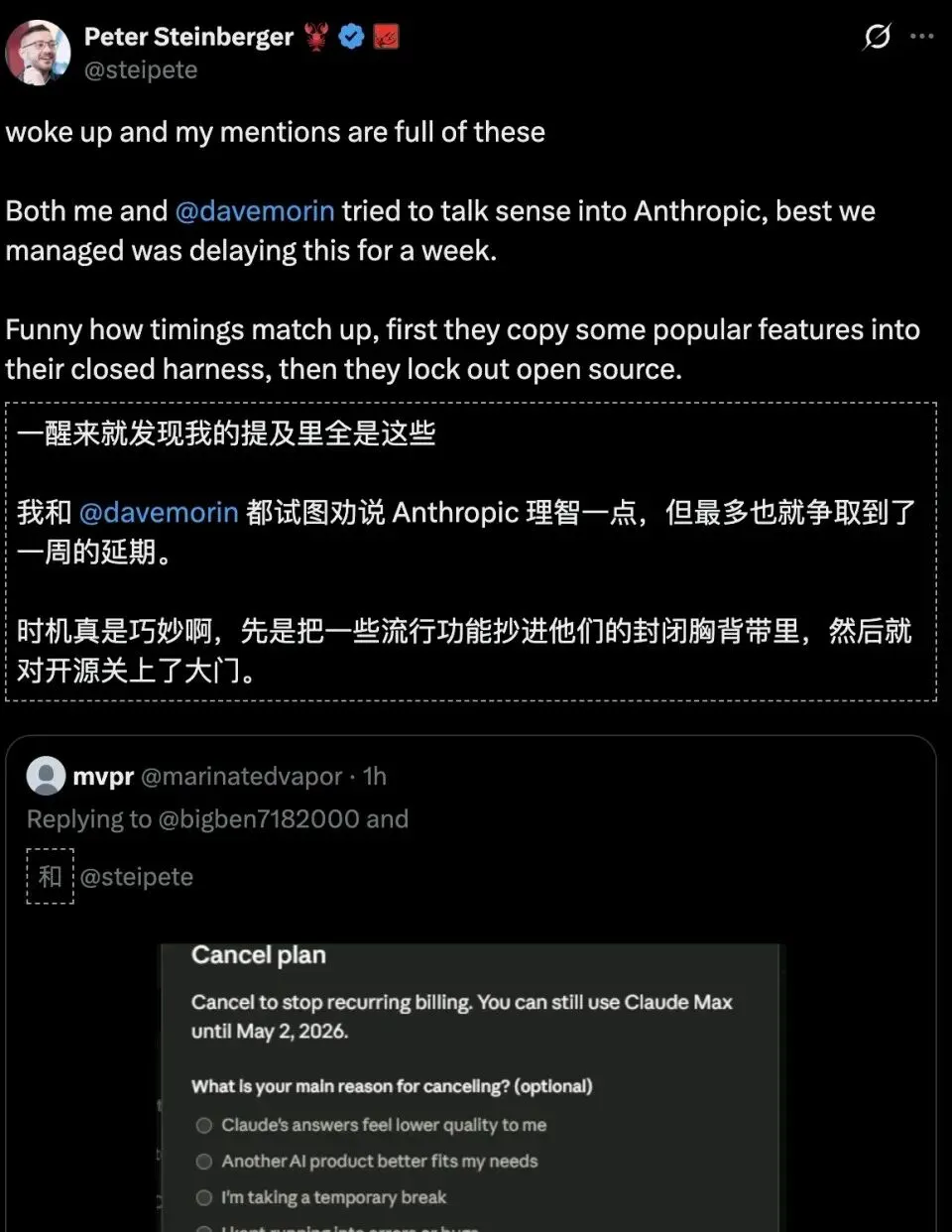 OpenClaw的创始人Peter知道后也特别无奈,直说Anthropic这是“关门打狗”,用完开源社区的成果就翻脸不认人。