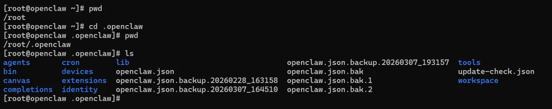 3、在root目录下输入 cd .openclaw ,在.openclaw目录中输入ls找到openclaw.json