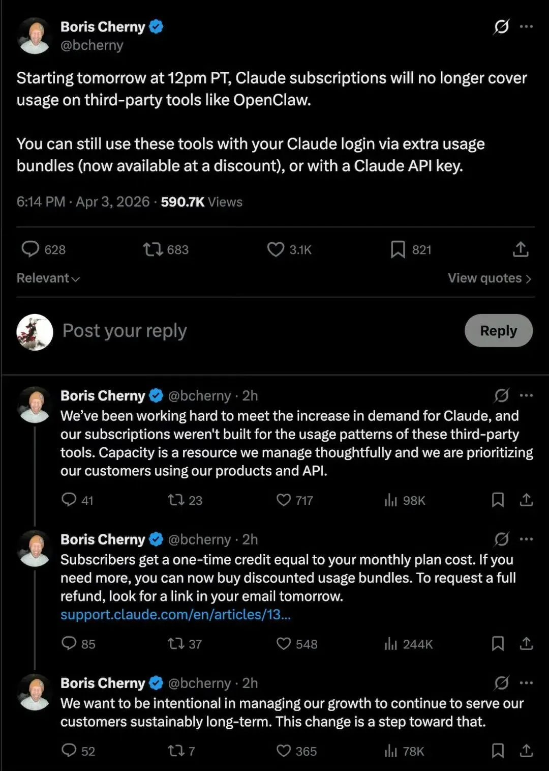 Claude Code 负责人 Boris Cherny 表示,自太平洋时间 4 月 4 日中午起,Claude Pro 和 Max 不再覆盖第三方工具产生的调用量。