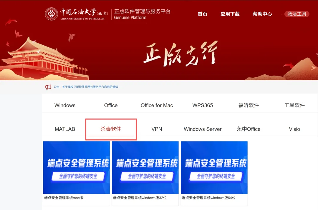 访问学校正版化平台(https://software.cup.edu.cn/),进入【杀毒软件】模块获取安装包。