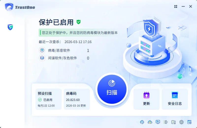 杀毒软件预设每月1号自动进行全盘扫描,日常运行时将保持静默处理模式,不影响正常学习办公。