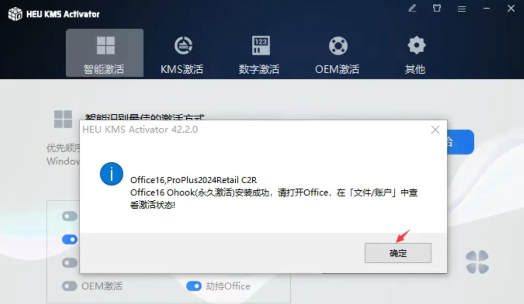 安装后不要立即打开任何 Office 组件。 以管理员身份运行我们提供的激活工具,点击“激活 Office”按钮。 等待提示“Product activated successfully”即表示激活成功。 打开任意 Office 应用(如 Word),点击“文件”>“账户”,查看产品信息确认已激活。