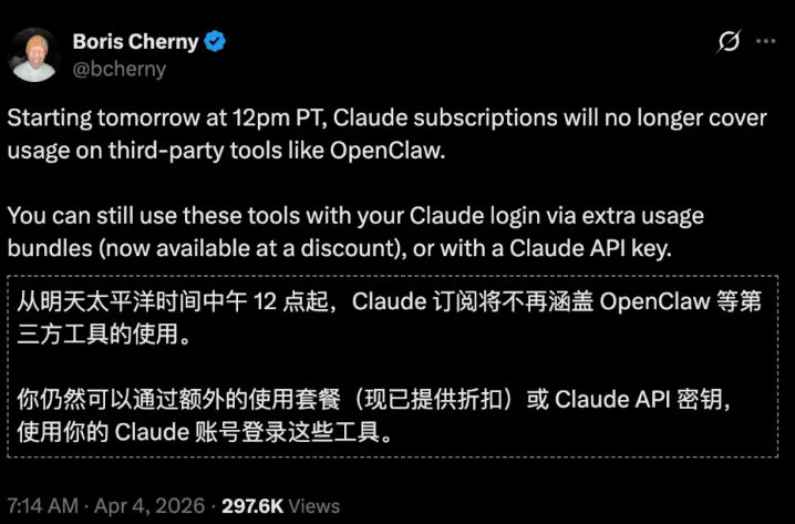 就在刚刚,全球AI巨头Anthropic正式发出通牒:美国东部时间4月4日15:00起,强行将OpenClaw踢出Claude订阅服务的白名单。Claude Code之父Boris Cherny宣布,Anthropic已明确禁止使用官方套餐接入OpenClaw。
