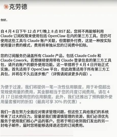4月3日,周五傍晚——正是互联网公司习惯发布坏消息的“黄金时间”。Anthropic向成千上万OpenClaw用户发出通知:明天起,你的Claude订阅额度将不能再用于OpenClaw,想继续使用,只能按量计费。